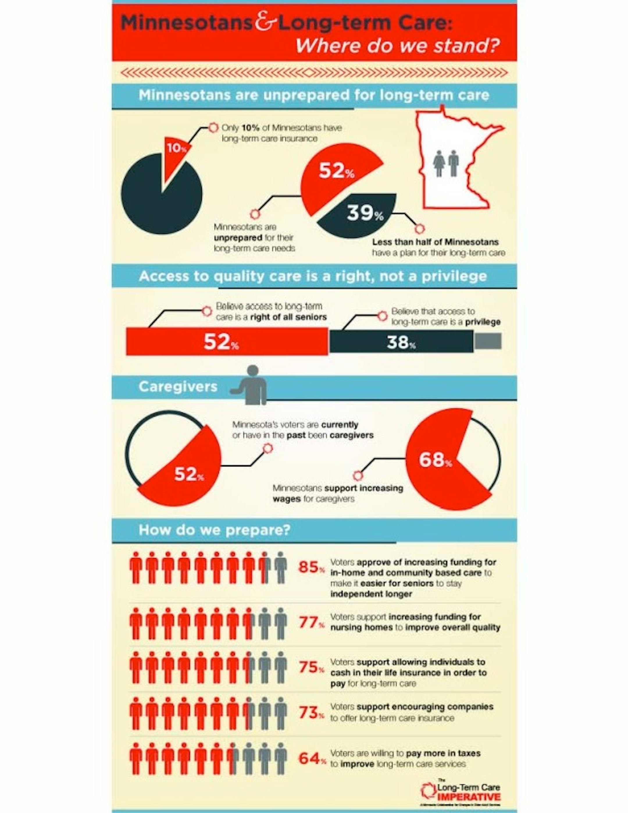 In fact a majority of Minnesotans (52 percent) say have no plan for how they'll pay for supportive services. This according to a new poll conducted by The Long-Term Care Imperative (LTCI), a collaboration of Aging Services of Minnesota and Care Providers of Minnesota, which are membership associations of senior service organizations across the state. As you look at the infographic below, one other thing to consider: In 1965, when Medicaid was created (the federal-state program that pays for most long-term care costs after people spend into poverty) Alzheimer's Disease was a phrase largely isolated to medical journals. Today 100,000 Minnesotans live with it. Absent a cure, by 2050, nearly a quarter million Minnesotans will have it at a cost of $20 billion according to the Preparing Minnesota for Alzheimer's Report, prepared for the Minnesota State Legislature by the Minnesota Board on Aging.