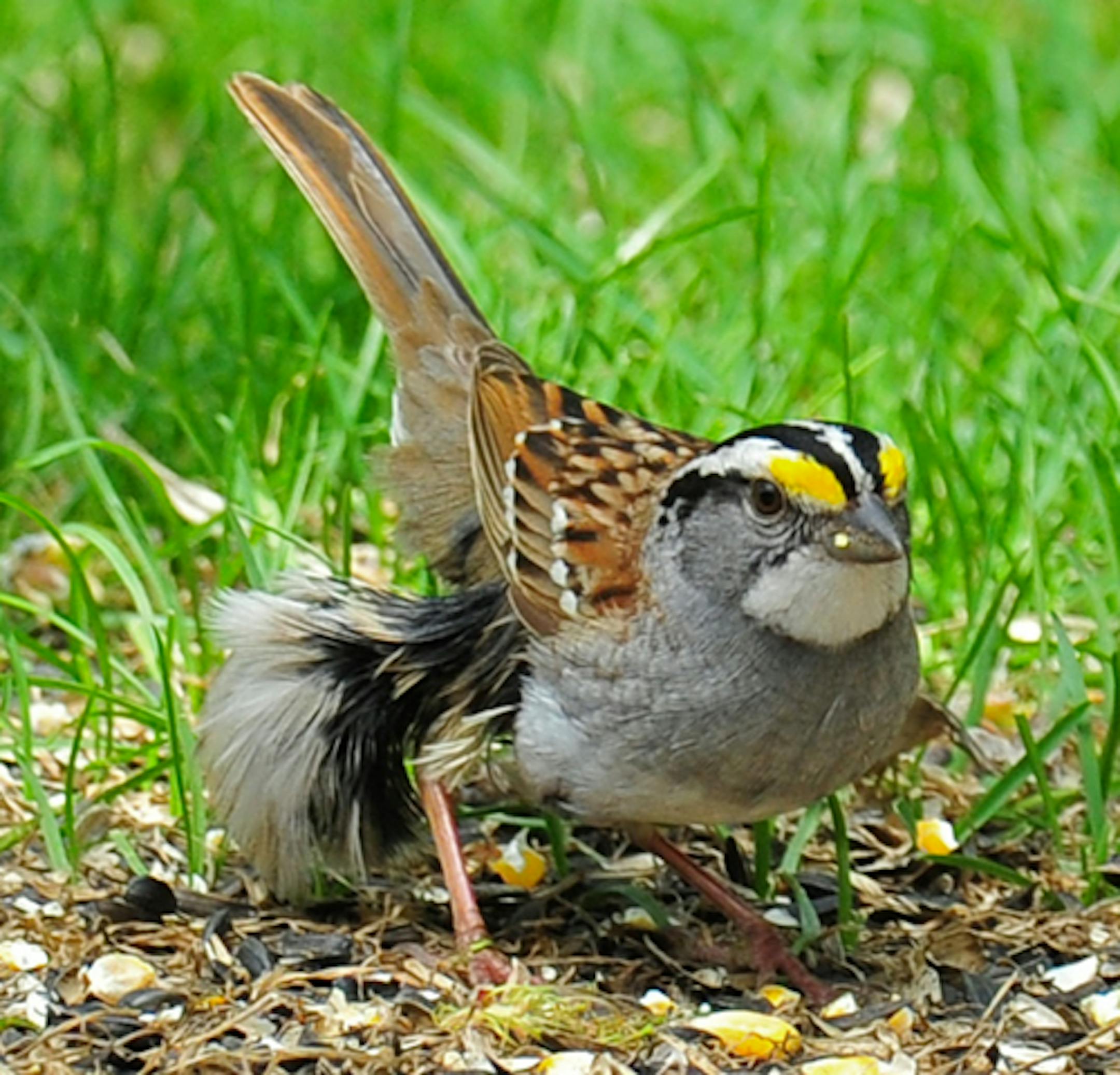 Feeding in our yard today was a White-throated Sparrow with a tuft of seriously misplaced feathers. They protrude from the bird's rigth flank, like a feather duster attached to the bird's hip. Behavior of the sparrow appeared ordinary. It moved on the ground and flew without apparent problem. Did the bird have a narrow escape from a predator, a claw tearing the feathers as the bird flew? Looks like a lot of feather for that part of the body doesn't it? And the dark color seems wrong. Doesn't make much sense. The sparrow's bill appears odd because the bird was manipulating a piece of cracked corn.
