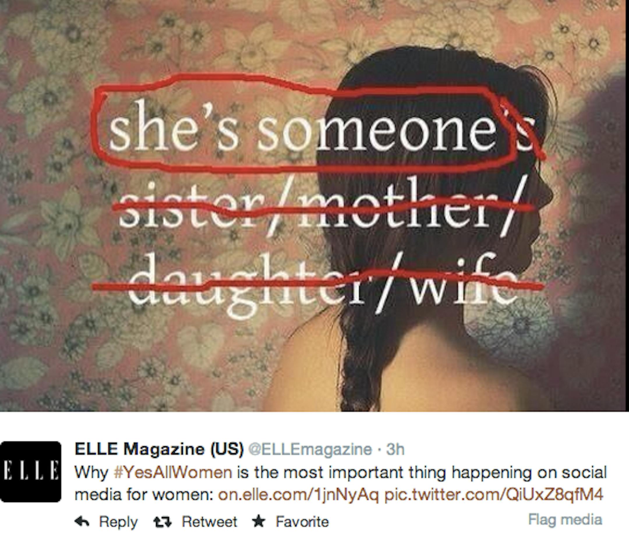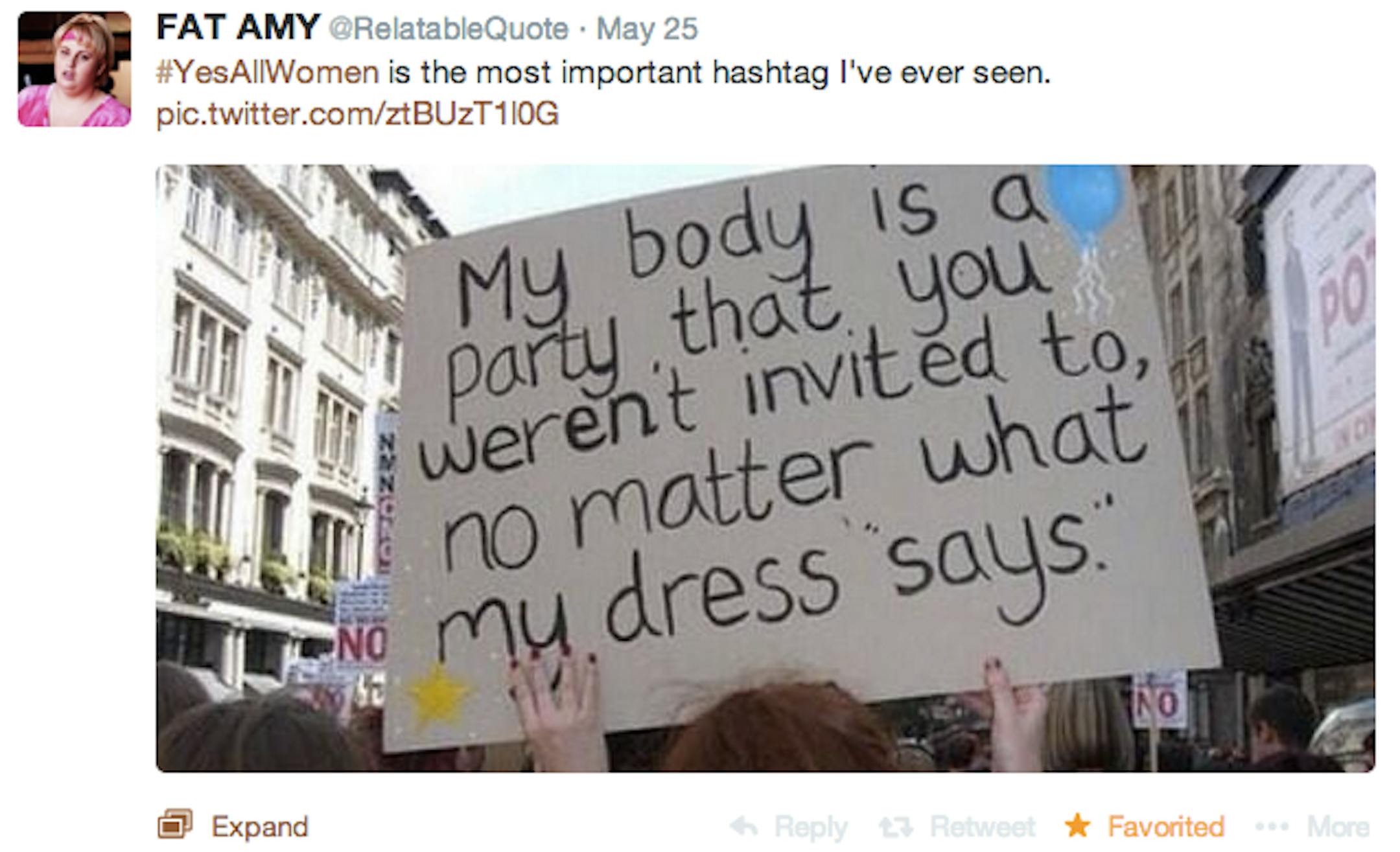 Using the hashtag #YesAllWomen, the initial response to the murderer's hate-filled video soon took on a life of its own, with women from all over the world sharing sobering quotes, statistics, facts, and their personal or collective experiences of abuse, sexism, violence, and harrassment. Voices that are all too often silenced by sexism and fear suddenly found a collective voice through #YesAllWomen, and it continues to swell.