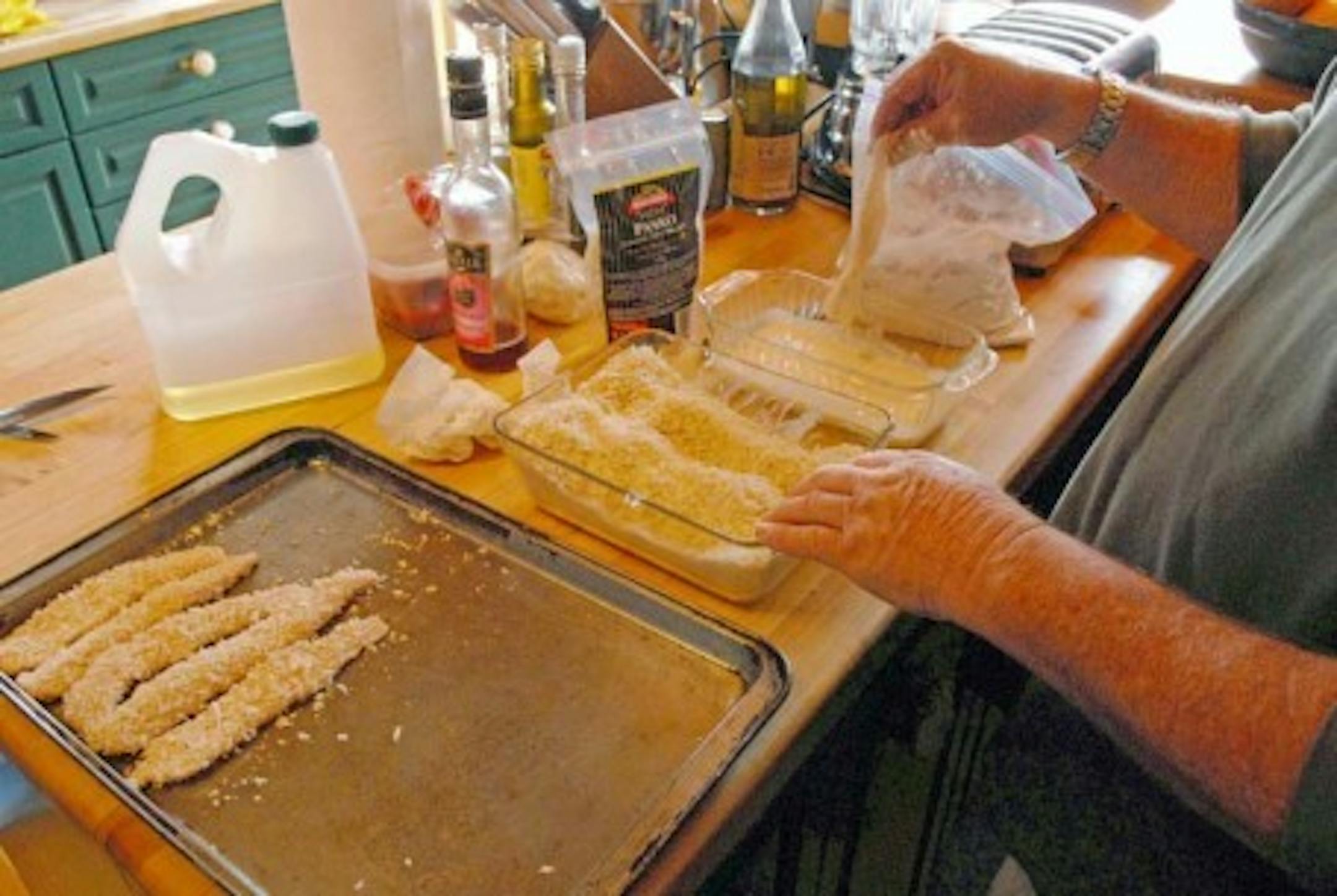 The walleye fingers are then transferred to a pan while oil (he uses Canola) is heated, and the fish are fried.