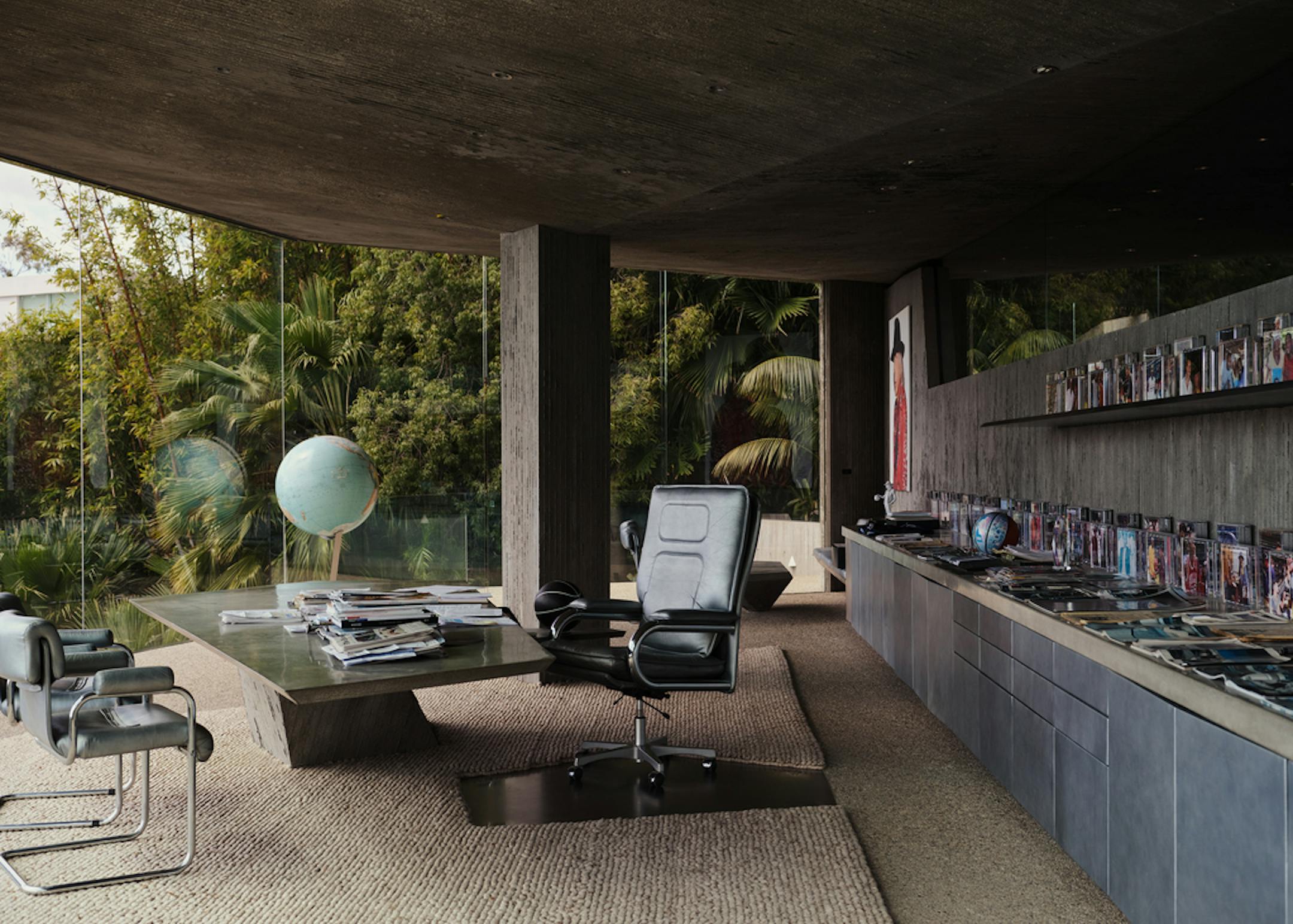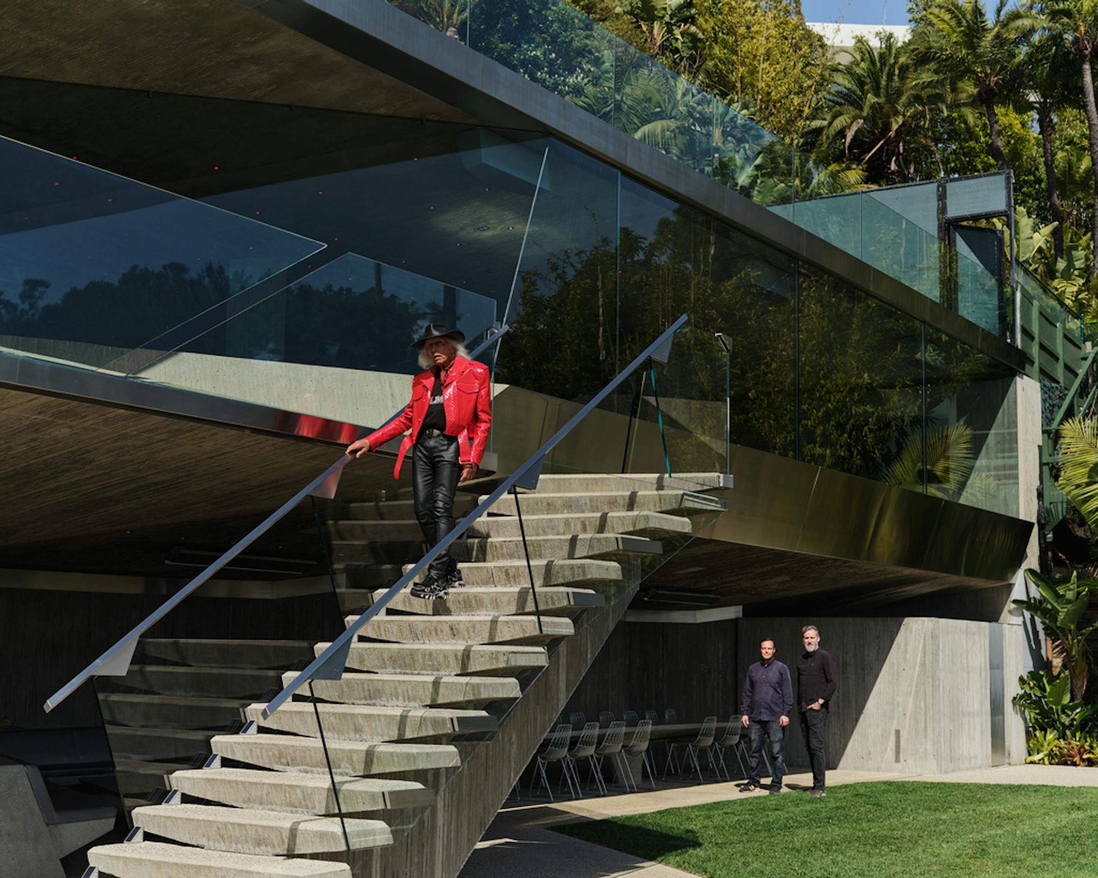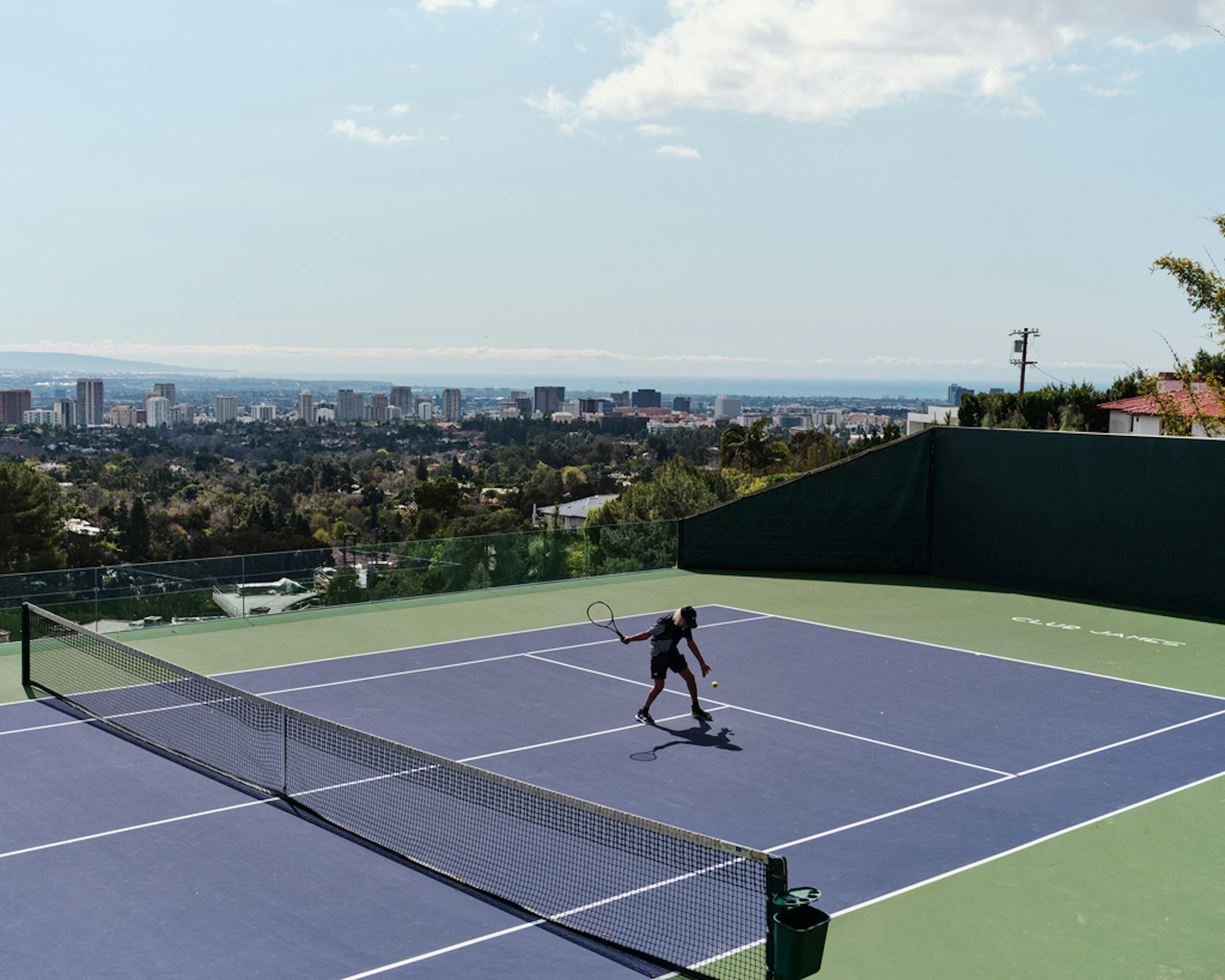 “The word ‘subtle’ doesn’t exist for me,” Goldstein said, dressed in all-black tennis gear and a palm tree-emblazoned black jacket. He’s sitting on the sprawling lower terrace of his home’s recently completed (for now) three-level addition, which is a separate compound overlooking the towers of Century City and, beyond that, the glinting bend of the Pacific coast.