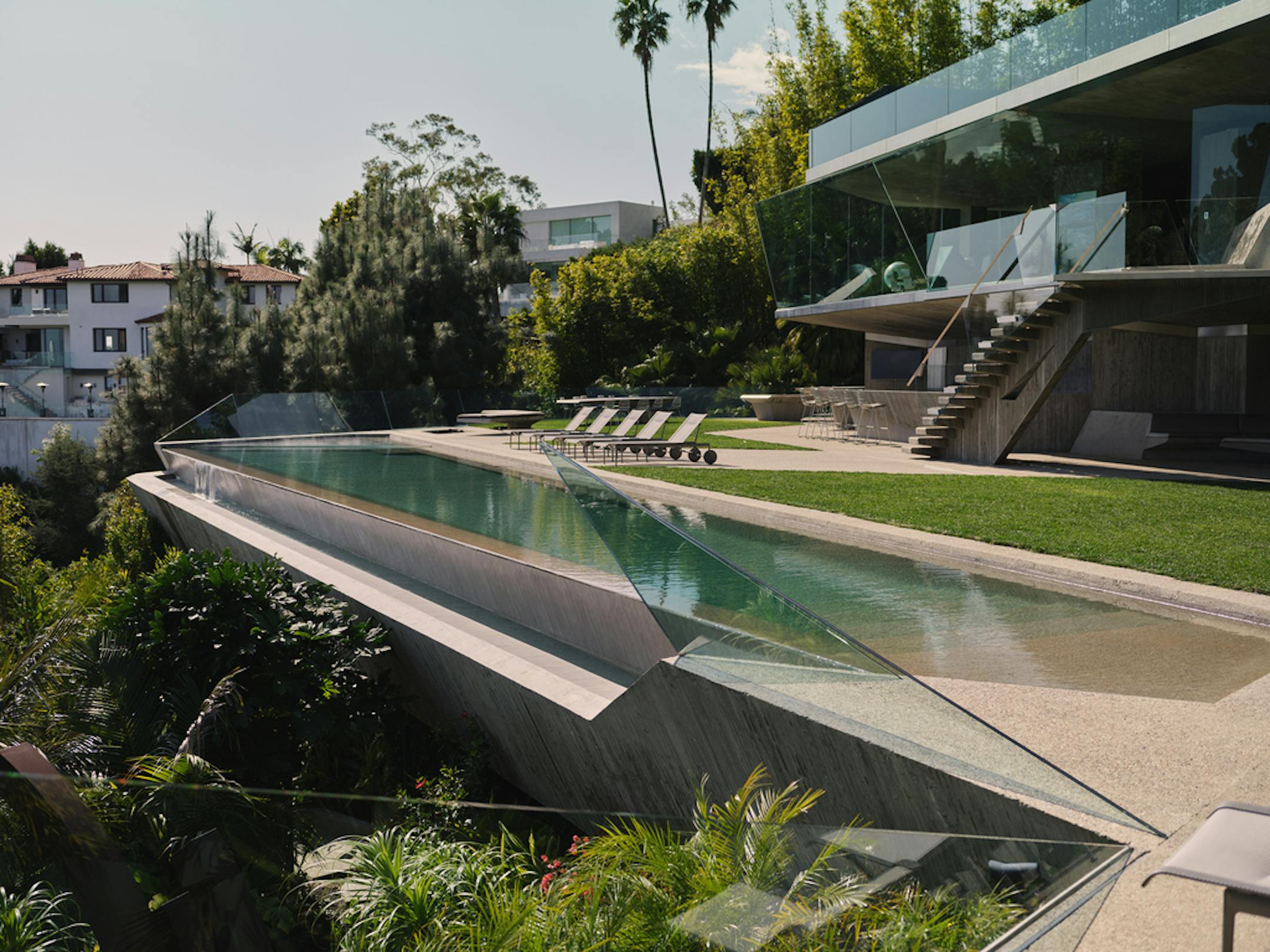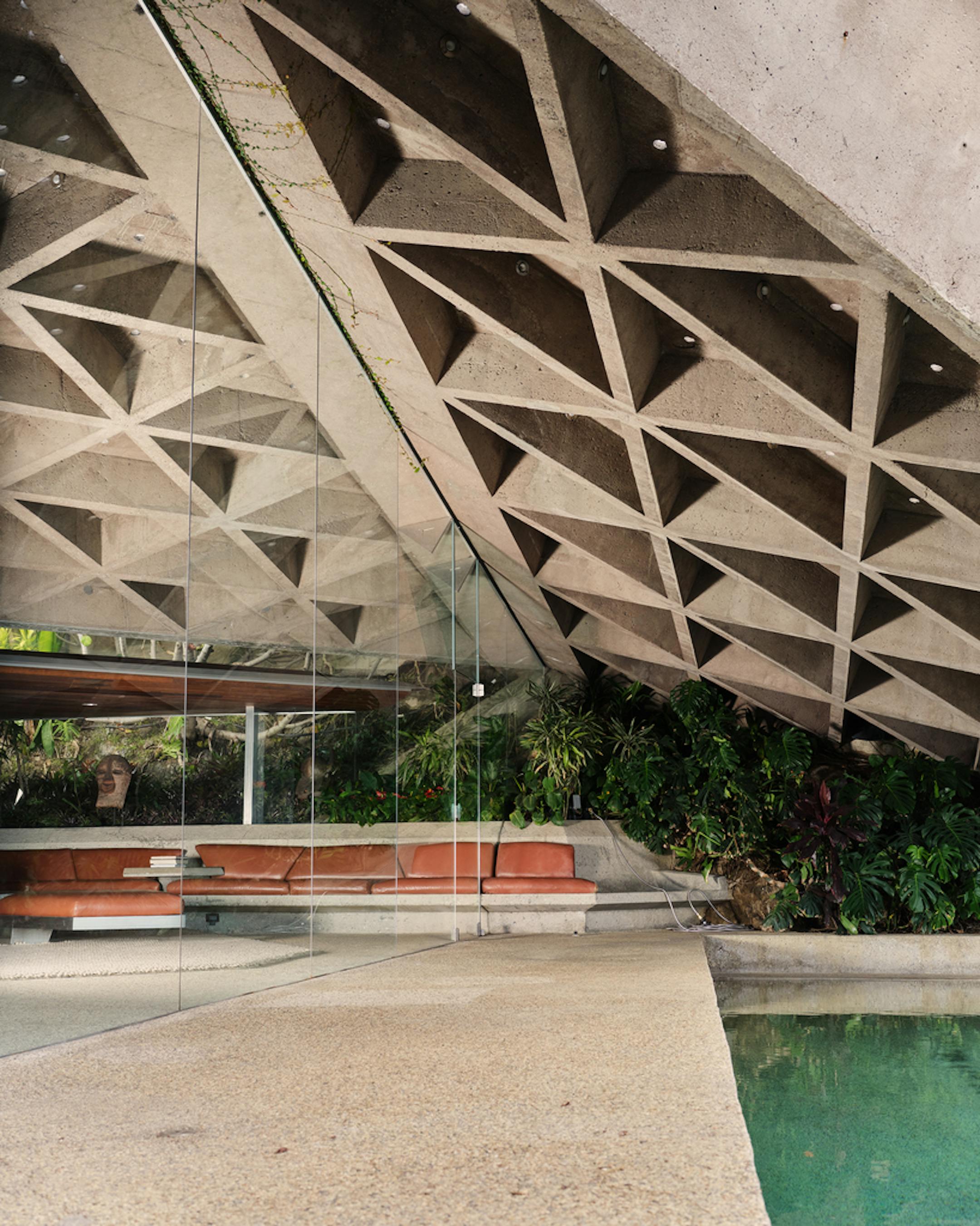 After visits to places like Hawaii and Thailand, Goldstein installed, with the help of landscape architect Eric Nagelmann, tropical foliage, enveloping the site in thick palms, bamboo, winding paths and bladelike stairs.