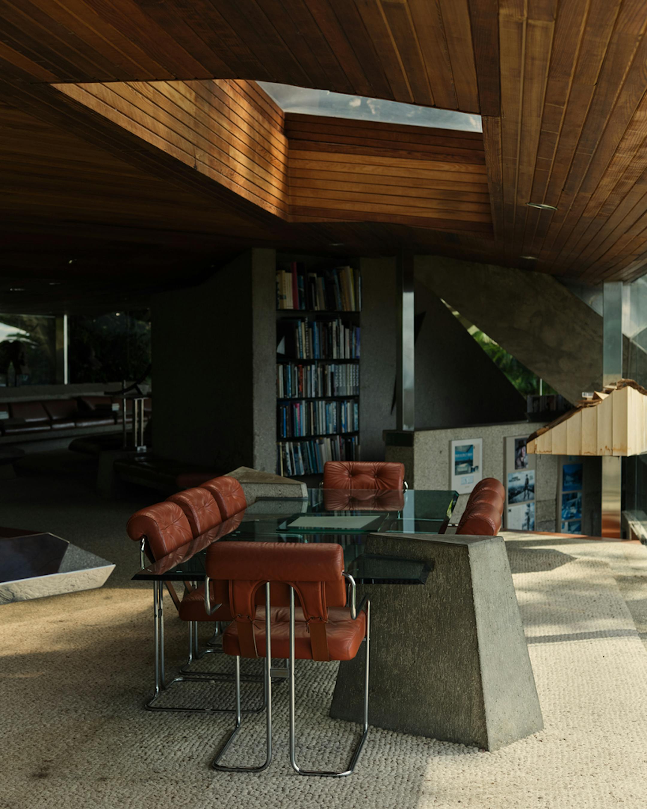 Goldstein bought the Sheats-Goldstein house (built in 1963 for Helen and Paul Sheats, an artist and a doctor, and their children) for $182,000 in 1972. Aghast at its cramped feel and banal plaster, stucco and Formica surfaces, he enlisted Lautner himself to make improvements. Over about 20 years, they removed cluttered divisions and installed frameless glass windows, concrete and wood ceilings, built-in leather-covered furniture and automated skylights.