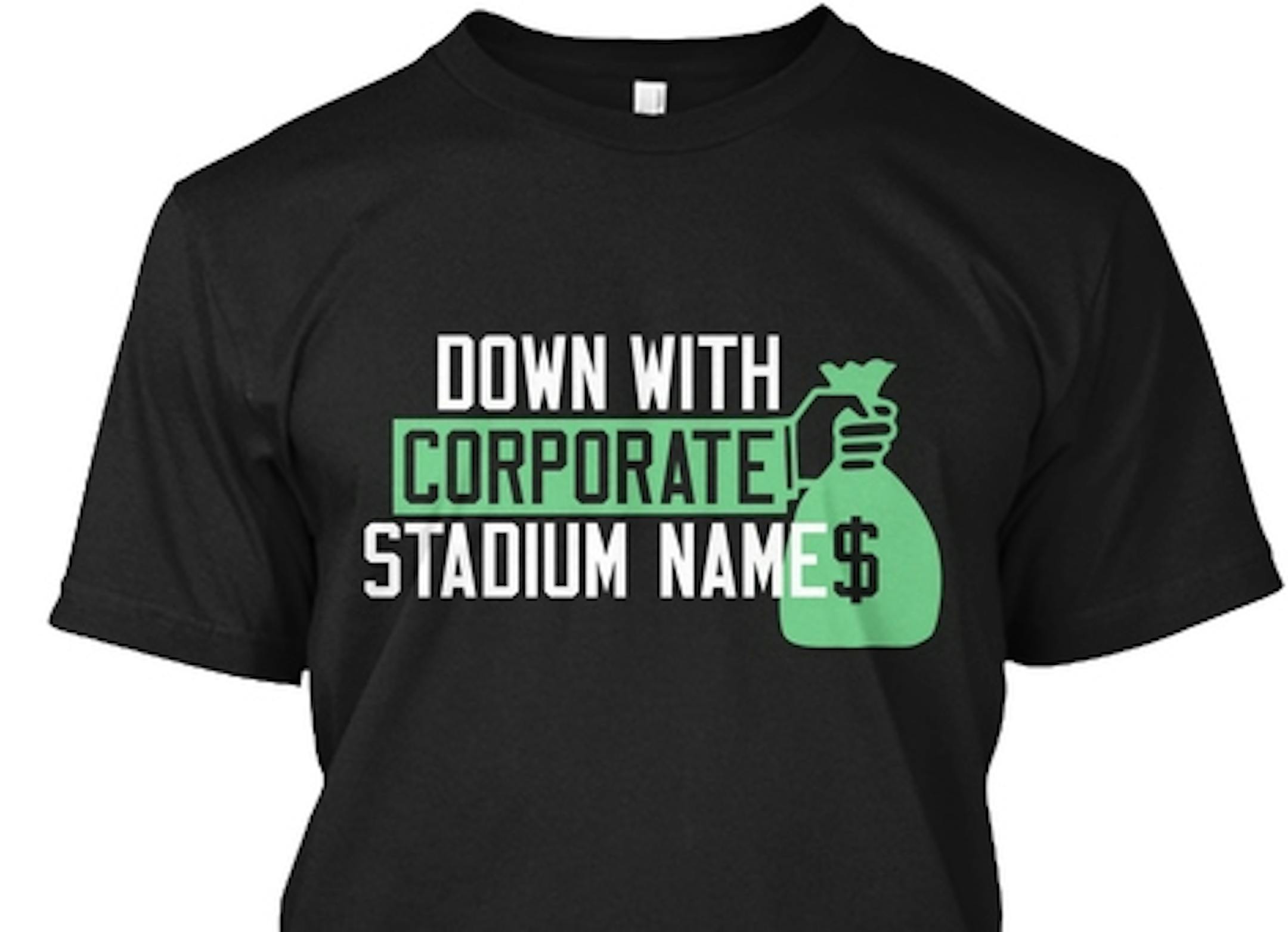 There is the basic shirt decrying "Down with corporate stadium names" along with an anonymous hand holding a bag of cash.