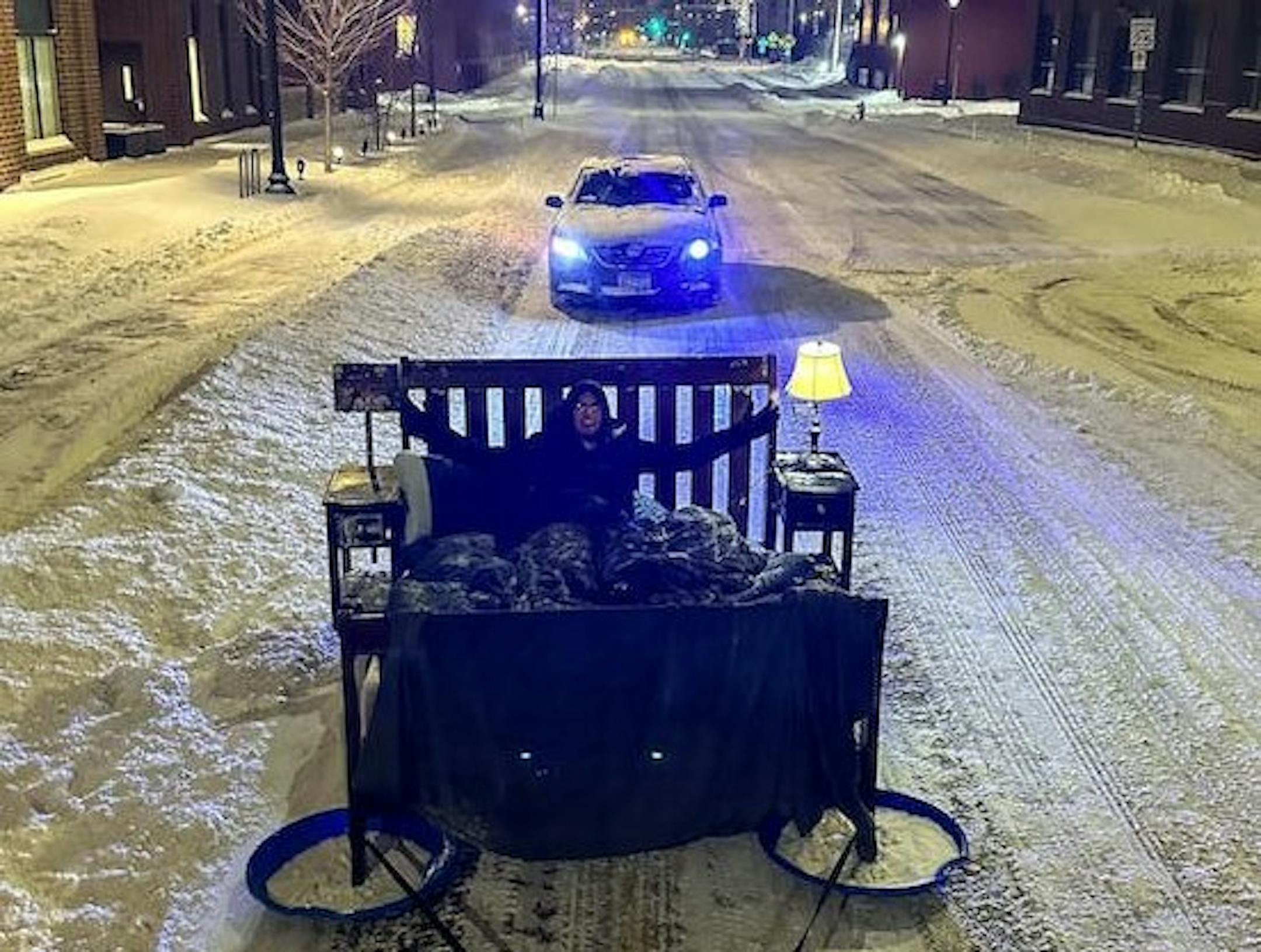 Sitting in the middle of a full-size bed, each leg of which was nailed to a saucer-shaped sled, Tanner Charles Schaaf bed-sledded past the Guthrie Theater and U.S. Bank Stadium, then posted a video to Twitter on Friday. The comfy ride was complete with a mattress, blankets, pillows and two matching nightstands with a working lamp.