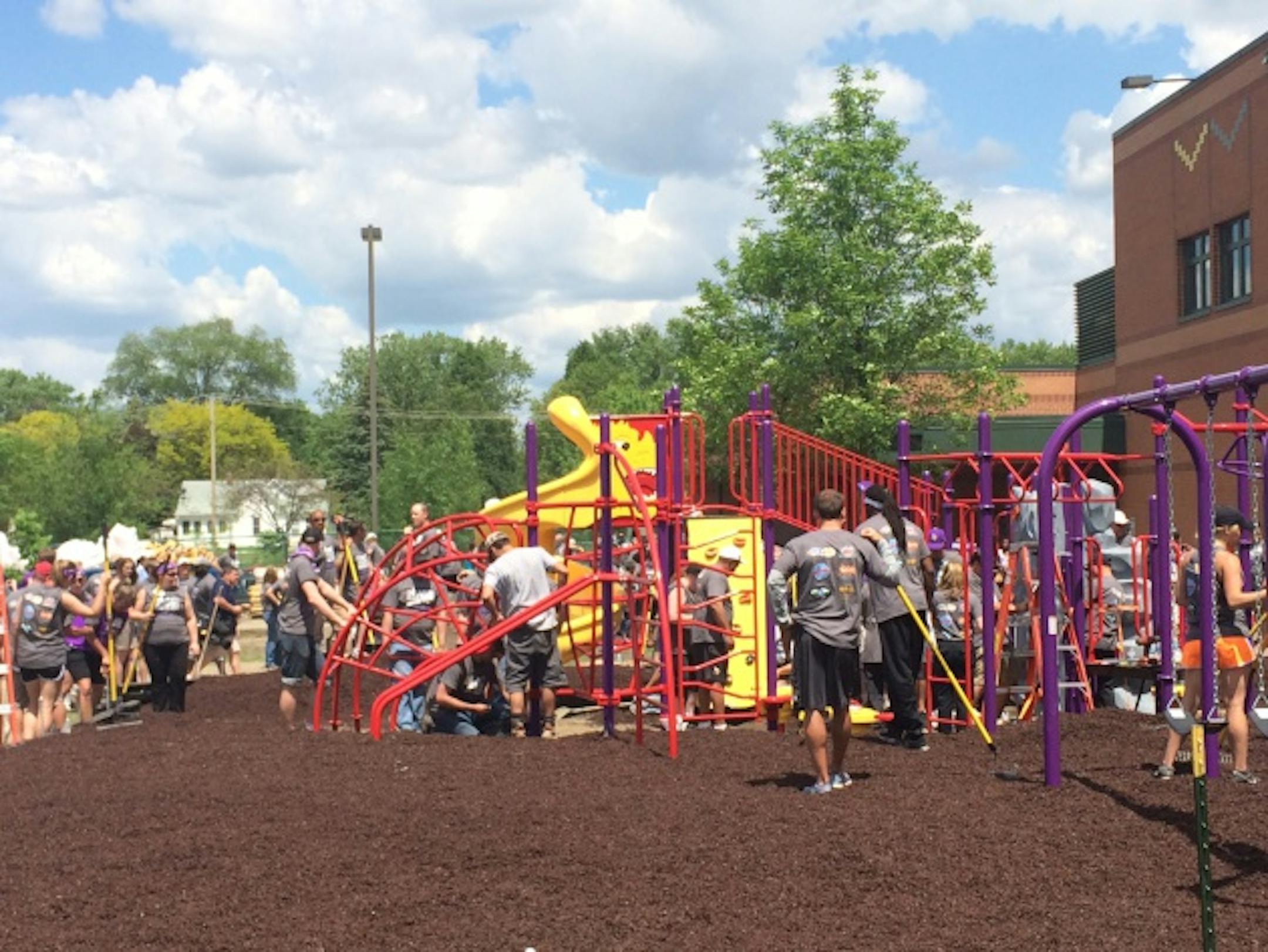 Most of the Vikings organization arrived after Wednesday's organized team activity workout, but some employees, including members of the media relations staff, arrived first thing in the morning to assist with the project. Zimmer, who mostly supervised at the playground build, said it was a good thing that the coaches and players got to spend some time together off the field.