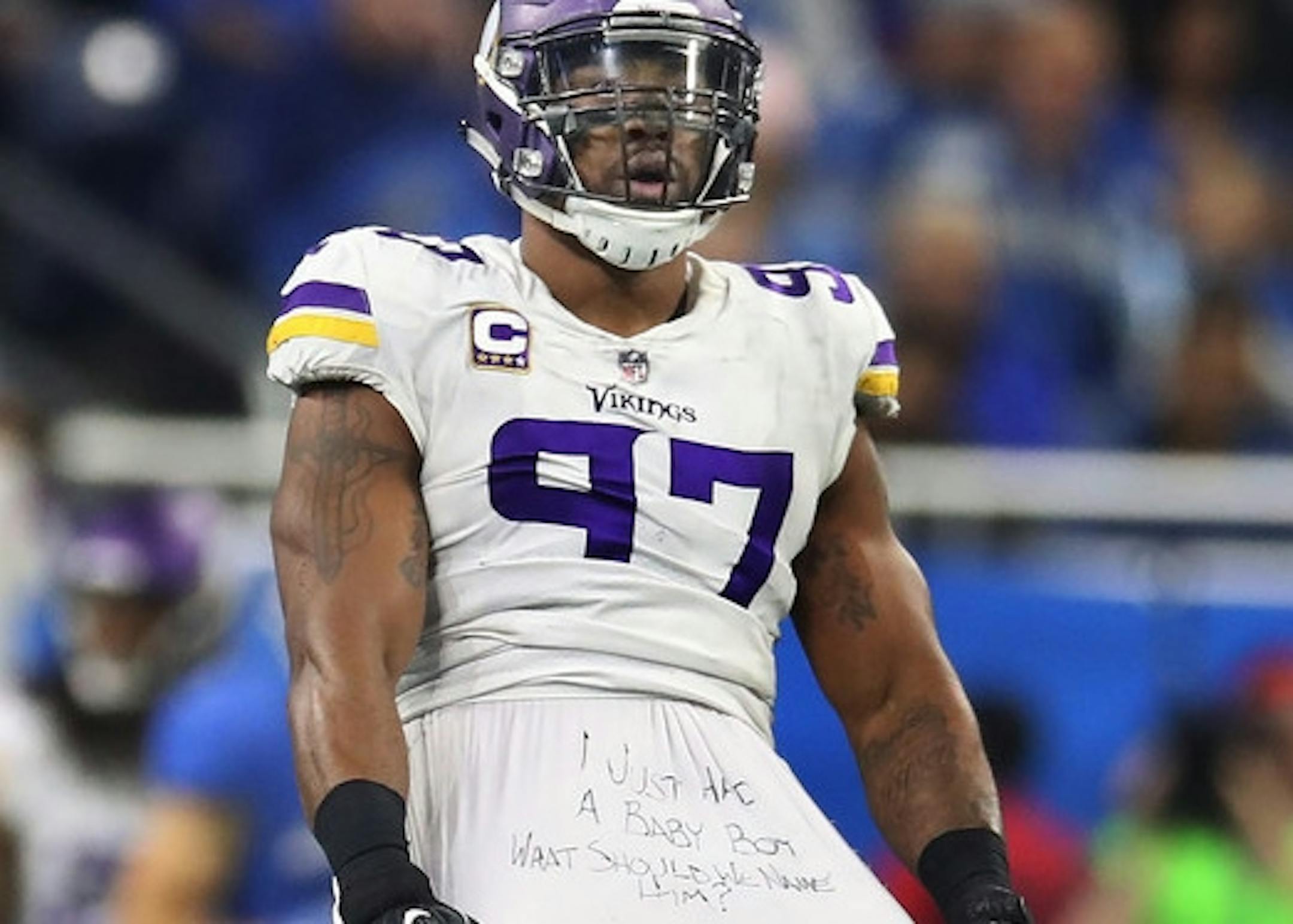 Star defensive end Everson Griffen and his wife Tiffany had a son born that day (Griffen watched the birth via FaceTime from Detroit), and you might recall he wore a white shirt under his jersey — which he pulled out mid-game for millions of viewers to see — that read: "I just had a baby boy. What should we name him?"